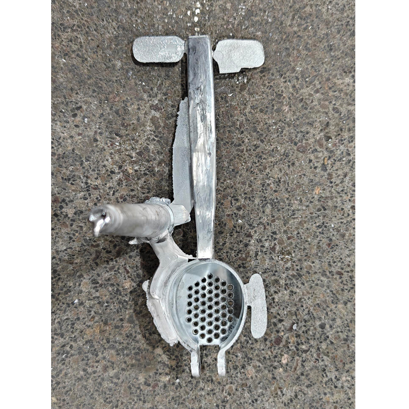 Billede 1 viser råstøbningstilstanden af hvidløgspressen. Efter at have gennemgået en grovbearbejdning poleres den manuelt. Billede 3 viser derefter delen efter at være blevet behandlet gennem en 180-graders høj-temperatur galvaniseringsautomatiseret produktionslinje. Til sidst samles de kvalificerede komponenter.