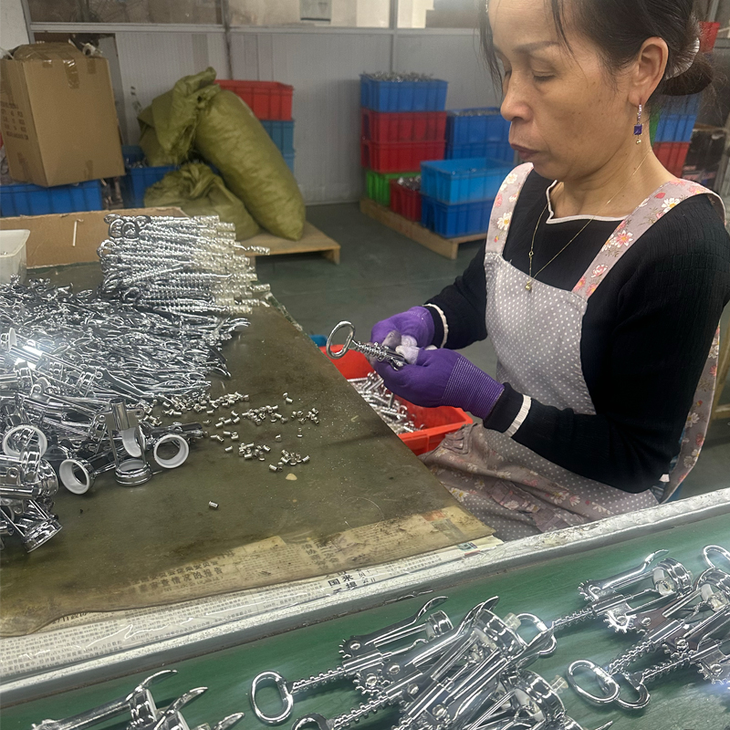 Hele proptrækkeren har nået sin endelige proces, som er montering. Først klassificerer vi alle forarbejdede halvfabrikata efter komponenttype. Kvalitetskontrolpersonale (QC) udfører foreløbige inspektioner for at bekræfte, at disse halvfærdige dele opfylder alle produktspecifikationer for funktionalitet, farve og overfladekvalitet. Kvalificerede og defekte dele sendes derefter separat. Produktionsafdeling og lagerafdeling. I overensstemmelse med den etablerede produktspecifikationsmanual opbevares kvalificerede halvfabrikata på lager og kommer efterfølgende ind i produktionslinjen til montering.