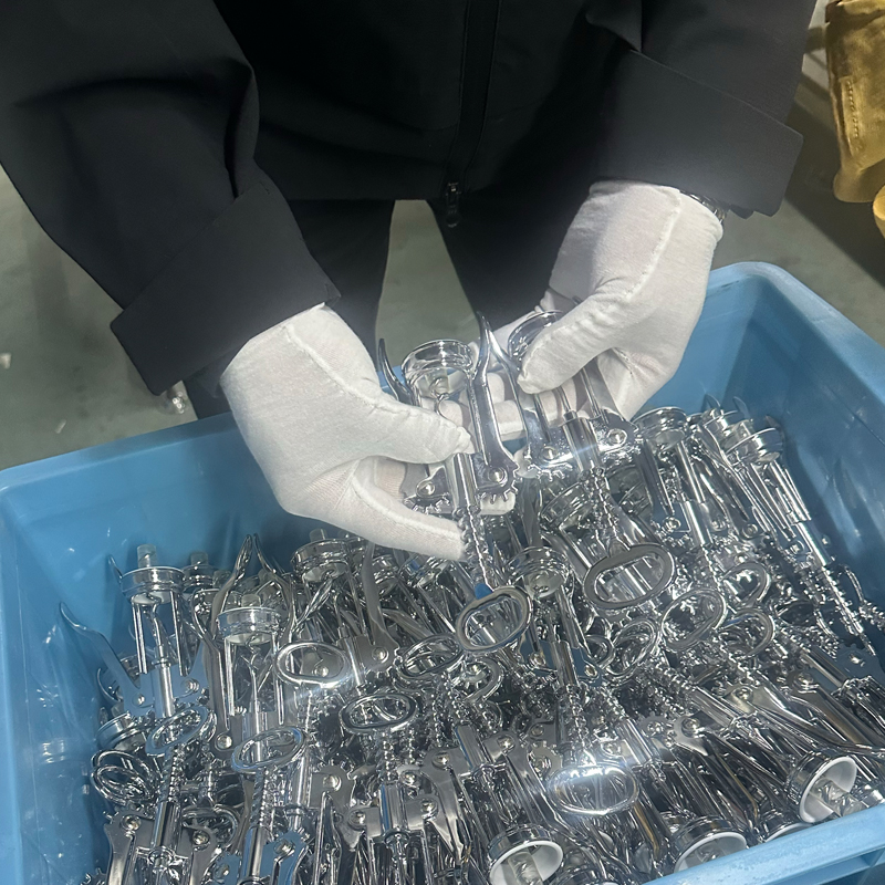 Efter at have fjernet grater og kanthjørner fra vinproptrækkeremnerne, fortsætter produktionsprocessen til polering og rengøring. Vores virksomhed råder over mere end ti rengøringsmaskiner og overfladefinishudstyr, hvilket gør os i stand til at opretholde ensartethed og konsistens i produktoverfladebehandlingen. Den største fordel ved denne operation er, at alle færdige produkter vil have ensartede overfladefinisher.