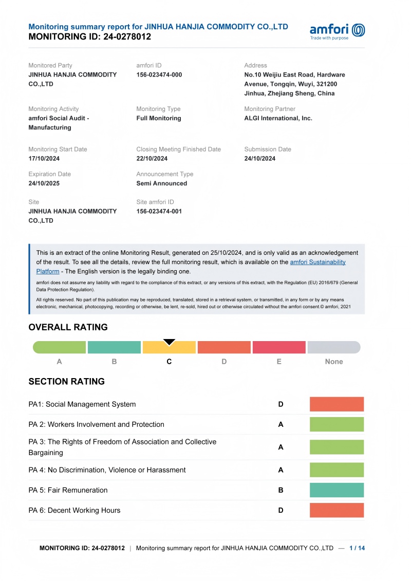 I juli 2025,Jinhua Hanjia Commodity Co., Ltd.med succes opnået et C-niveau-certificering i International Classification for Standards (ICS) Factory Audit Program, udført af det tredjeparts europæiske inspektionsagentur, der er udpeget af Cooperative Union Enseigne. Dette certificeringssystem består af fire niveauer: A, B, C og D. Som medlem af det franske handelskammer og industri (FCD) overholder virksomheden den internationale arbejdsorganisations sociale ledelsesordning SA8000, gennemførelse af sociale ansvarsrevisioner på dens leverandører. Revisionsanlægget dækker kritiske områder, herunder menneskerettigheder, arbejdsmarkedsundhed og sikkerhed, fabriksforhold, lønninger og dokumentationsudbydere.