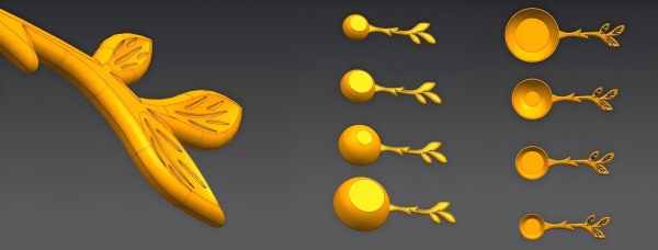 Først involverede vi vurdering af produktets form og potentielle brug baseret på tidligere erfaringer. Ved at bruge zinklegering som det primære materiale, beregnede vi materialetæthed og overfladekarakteristika, inkorporerede ergonomi og designede de overordnede dimensioner for de fire måleskeer eller isskeer. Efterfølgende forfinede vi hver kurve, R-radius-vinkler og andre små dimensionsvinkler.