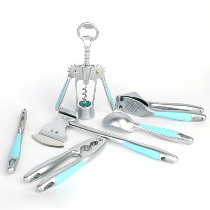 Denne holdbare nøddeknækker af zinklegering til hjemmekøkken er en del af et nyt premium køkkenudstyrssæt i 10 dele designet til moderne hjemmebrug. Kollektionen inkluderer en vinåbner, pizzaskærer, kødmørningsmiddel, hvidløgspresser, dåseåbner, grøntsagsskræller og nøddeknækker med isske. Vores unikke design har et markant fordelt plastikhåndtag med ensartet, geometrisk, ensartet geometrisk diamanthåndtag. sofistikeret. Brugen af macaron-inspirerede pastelfarver løfter den overordnede æstetik og forvandler produktet til et stilfuldt køkkentilbehør. Nøddeknækkeren måler 17 cm i total længde med en maksimal bredde på 5 cm og vejer 220 gram. Dens dobbeltstørrelses kæber kan rumme forskellige typer nødder med skaller og bløde skal, varianter. Det ergonomiske håndtag inkluderer et hængende hul for enden, hvilket muliggør praktisk vægmontering og maksimerer lagerpladseffektiviteten.